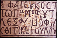 Umm al-Rasas - Detail of Greek inscription in mosaic in Church of St. Stephen