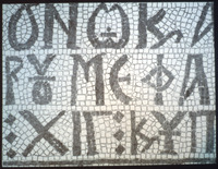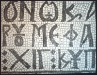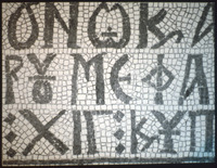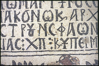 Umm al-Rasas - Detail of Greek inscription in mosaic in Church of St. Stephen