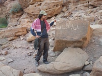 Jordan. Wadi Rum, path to Ain Shallaleh, Glenn Corbett of ACOR next to rock art showing modern damage