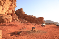Jordan. Wadi Rum, man cleaning up campfire next to Bedouin campsite