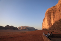 Jordan. Wadi Rum, group of Bedouin men at campsite in foreground, mountains in the distance