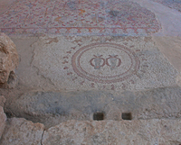 Jordan. Madaba, Madaba Archaeological Park West, welcoming sandals medalion embedded at the entrance to the east wing of the 6th-century Byzantine Burnt Palace, looking east