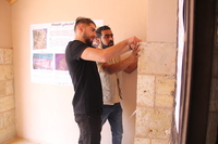 Jordan. Wadi Rum, AbedalFattah Ghareeb and Mohammad Al Domyan hang posters at visitor center