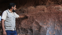 Jordan. Wadi Rum, Mohammed Al Domyan of the Wadi Rum Protected Area explaining rock art and Thamudic and Arabic inscriptions