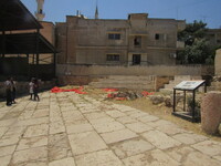 Jordan. Madaba, Madaba Archaeological Park West, 2nd-century paved Roman plaza with 6th-century Byzantine Martyrs Church to the left, modern building in the middle, and interpretive sign on the right, looking south