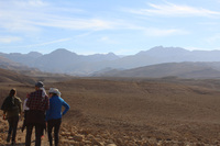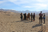 Jordan. Wadi Araba, Bir Madhkur, group of visitors walking on ad-Dlayi path, part of the ancient incense route which leads from Khirbat Bir Madhkur to Petra, with an interpretive sign installed with support from USAID SCHEP