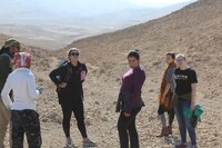 Jordan. Wadi Araba, Bir Madhkur, group of visitors walking on ad-Dlayi path, part of the ancient incense route which begins from Khirbat Bir Madhkur and leads to Petra
