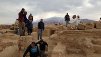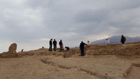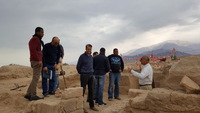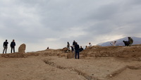 Jordan. Ghawr as Safi, lower area in front (north) of the sugar presses. Sugar juice conduit on the right of photo, leading to the sugar processing (boiling and curing) area in the background at sugar factory (Masna’ as-Sukkar), SCHEP team in distance
