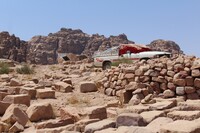 Jordan. Petra, Temple of the Winged Lions, wheelbarrow, liquid container inside tent