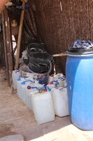 Jordan. Petra, Temple of the Winged Lions, water canisters inside tent, guffahs (buckets made out of used tires)
