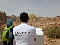 Jordan. Petra, Temple of the Winged Lions, Nizar Al Adarbeh and visitor in front of glass sign