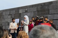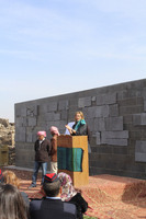 Jordan. Umm al Jimal, Jenna Morton giving a speech at groundbreaking ceremony, visitors