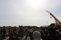 Jordan. Umm al Jimal, crane for restoration activities, Barbara Porter and other visitors