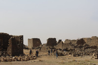 Jordan. Umm al Jimal, Commodus Gate, visitors, scaffolding in background
