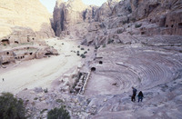 Jordan. Petra, Khaznet Far'oun (The Treasury) with horse riders
