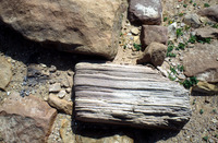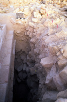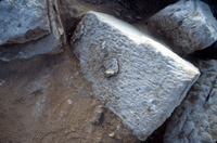 Detail of sandstone ashlar block in wall of central apse. View to east. Pre-application of Wacker O.H. consolidant. Roll 1 - 36.