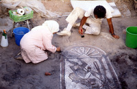 Tom & Fatma cleaning off mosaic in B1 for photograph. - Sq. B1.