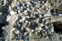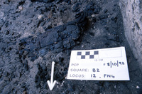 Close-up view to south of textile (ball of spun goats hair??) in-situ. - Sq. B2. Locus 12/FN4.