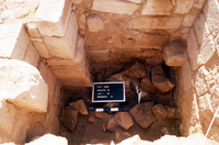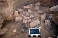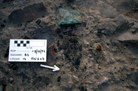 Close-up view to west of Cu/Cu alloy door hinge in-situ. - Sq. B2. Locus 12/FN6 & 7.