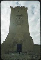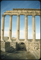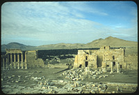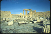 Temple of Bel: from east: NW corner of temple, colonnade, momumental arch, and Arab fortress in bkgrd colonade, momumental arch, and Arab fortress in bkgrd