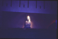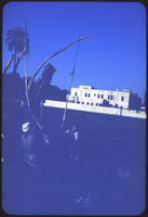 Looking up at painted pillars with Christian scenes in Pillared Hall
