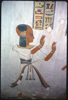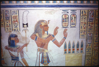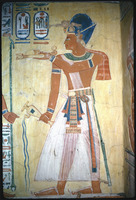 Paintings in Tombs of the Queens depicting Ramesses III, son, and offering table before Iris