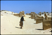 Wil going up paved processional way past sphinx and lion
