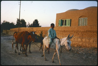 Boy bringing donkeys and cow home for the night