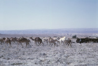 Jordan. Bab edh-Dhra', on way to site. Bedouin and camels