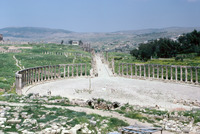 Jordan. Jerash, looking north at Forum and down colonnaded street (Cardo maximus)