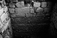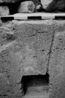 Jordan. Iraq al-Amir, square II.3, looking east at closeup of peg-hole channel at west end of square