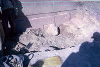 Jordan. Iraq al-Amir, feline fountain being cleared in first course of Qasr al-Abd east wall