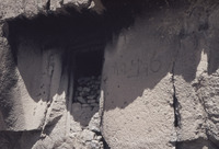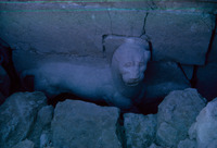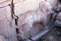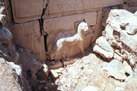 Jordan. Iraq al-Amir, feline fountain in lowest course of east wall, before clearing of Byzantine wall in front