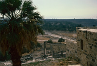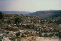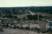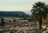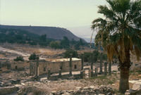 Jordan. Umm Qais (Gadara), general view over the westward extension of the Umm Qais plateau towards the north Jordan Valley and Lake Tiberias, with Ottoman houses and re-used Roman columns of the Byzantine basilica in the foreground