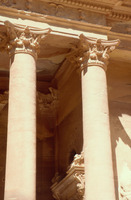 Jordan. Petra, Khaznet Far'oun (Treasury), detail of the trabeation of the lower order of columns, showing the delicate frieze of tendrils and volutes and the floral capitals with double rows of acanthus leaves
