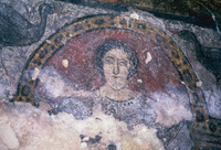 Jordan. Qusayr Amra, torso of the female figure holding the medallion with the portrait of the caliph or prince on the soffit of the east arch of the great hall
