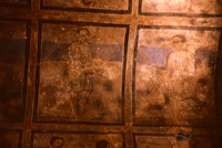 Jordan. Qusayr Amra, general view of the vault of the left bay, with artisan scenes. On the upper part, the decorative arrangement of the soffit of the arch which leads into this aisle may be observed, with the female figures holding a medallion