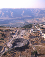 View Umm Qais with Golan hights behind, showing present day village, Roman Theater colonnaded street and forum