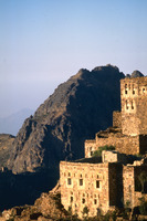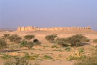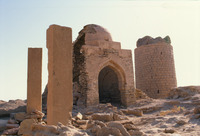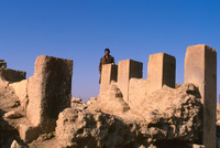 Yemen. Baraqish, Islamic building and ancient columns inside walls