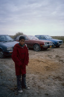 Jordan. Azraq, Ain Al Assad, boy standing by cars