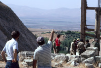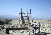 Jordan. Pella (Tabaqat Fahl), Brian Bowen and David McCreery and workmen with wooden scaffolding surrounding column and capital