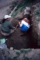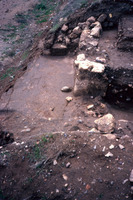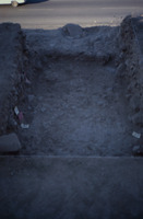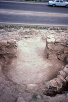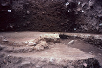 Jordan. Ain Ghazal, apsidal house with fire pit in left foreground and burial pit, seen from north