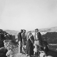 Paul Lapp, standing slightly behind others -- ‘Iraq al-Amir is situated on the west bank of the Wadi es-Seer, about 17 km west of Amman and 29 km. It is located about 4 km upstream from the confluence of the Wadi es-Seer with the Wadi Kafrein. The ‘Iraq al-Amir region includes a megalithic Hellenistic monumental building (Qasr al-‘Abd). Two hundred meters northwest of the ancient village are two tiers of natural caves, two of them with the name “Tobiah” deeply engraved near their entrances. (Ji, Chang-Ho C. “A New Look at the Tobiads in 'Iraq al-Amir” Liber Annuus 1998 v. 48 (XLVIII) p. 417.)