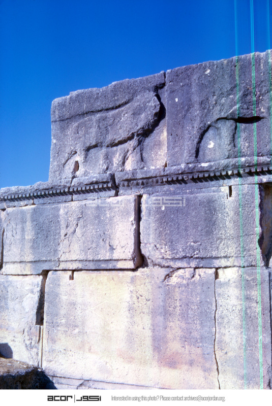 Jordan. Iraq al-Amir, three upper courses and lion frieze at northeast end of Qasr al-Abd