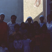 Jordan. Zarqa, Friend of Nancy Lapp visiting the Adawi family at home. Top row, from left: Mufida Salim, Mohammed "Abu Ahmed" (father of ACOR Facilitator Saeed and Facility Manager Abed), Jalila Salim, Kawthar Abd Al Hameed (mother of Saeed and Abed), Nan