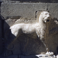 Jordan. Iraq al-Amir, Qasr al-Abd, closeup of feline fountain with wall removed