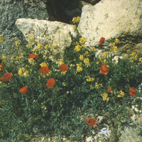 Jordan. Iraq al-Amir, red poppies in Qasr al-Abd