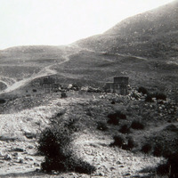 Lantern slide from Pittsburgh Theological Seminary -- ‘Iraq al-Amir is situated on the west bank of the Wadi es-Seer, about 17 km west of Amman and 29 km. It is located about 4 km upstream from the confluence of the Wadi es-Seer with the Wadi Kafrein. The ‘Iraq al-Amir region includes a megalithic Hellenistic monumental building (Qasr al-‘Abd). Two hundred meters northwest of the ancient village are two tiers of natural caves, two of them with the name “Tobiah” deeply engraved near their entrances. (Ji, Chang-Ho C. “A New Look at the Tobiads in 'Iraq al-Amir” Liber Annuus 1998 v. 48 (XLVIII) p. 417.)