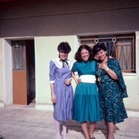 Jordan. LuLu and Lena Khasawneh with Linda Jacobs in front of her house