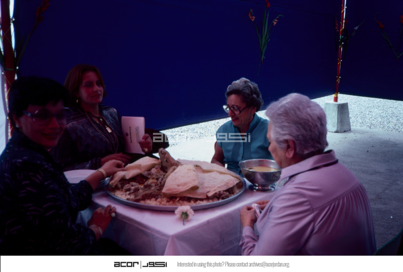 Jordan. Arab Potash Company inaugaration ceremony, 17 March 1982with Kady, Aunt Flo, Violet Jabara (Linda Jacob's mother) and traditional Jordanian dish "mansaf"